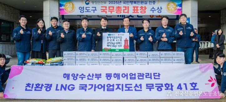 전국신문언론노동조합 조창제 기자 | 해양수산부 동해어업관리단은 지난 12월 19일 영도구청을 방문하여 ‘희망2026 나눔캠페인’의 일환으로 영양제김치 5kg 60박스와 쌀 10kg 15포(환가액 262만 원 상당)를 기탁했다.