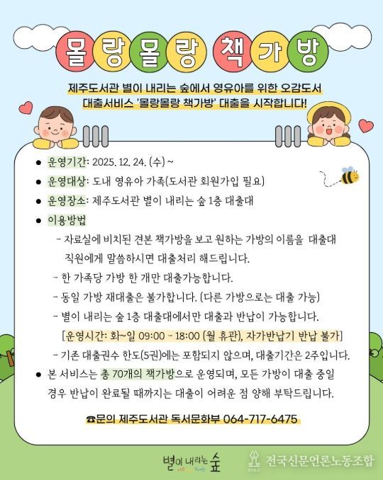 전국신문언론노동조합 김성길 기자 | 제주도교육청 제주도서관은 24일부터 영유아 오감도서 대출 서비스 ‘몰랑몰랑 책가방’을 운영한다.