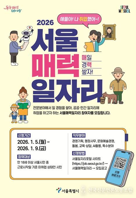 전국신문언론노동조합 강찬희 기자 | 서울시는 직무교육과 실제 일 경험을 통해 민간 취업으로 연계하는 대표 디딤돌 일자리 사업인 ‘서울 매력일자리’를 2026년 총 3,600명 규모로 확대 운영한다.