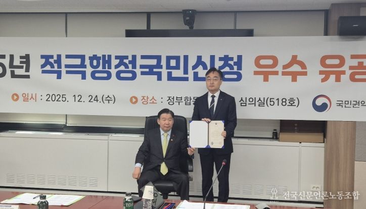 전국신문언론노동조합 김성길 기자 | 한국전력이 12월 24일 국민권익위원회가 주최한 ‘2025년도 적극행정국민신청 유공’ 시상식에서 ‘우수기관’ 및 ‘우수직원’ 2개 부문에서 국민권익위원장상을 수상했다.