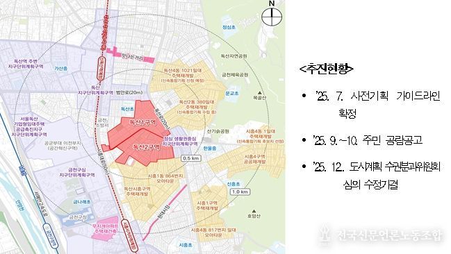 전국신문언론노동조합 강찬희 기자 | 서울시는 2025년 12월 24일 '제14차 도시계획위원회 신속통합기획 정비사업 등 수권분과위원회'를 개최하여 ‘독산동 1036일대(독산1구역)’과 ‘독산동 1072 일대(독산2구역)’ 주택정비형 재개발사업 정비구역 지정 및 정비계획 결정(안)을 '수정가결' 했다고 밝혔다.