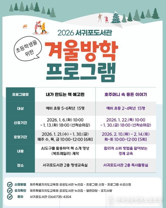 전국신문언론노동조합 김성길 기자 | 제주도교육청 서귀포도서관은 겨울방학을 맞아 어린이들의 호기심을 자극해 책 읽기의 즐거움과 경제 감각을 키우는 겨울방학 프로그램을 운영하며, 내년 1월 6일부터 참가자를 모집한다.