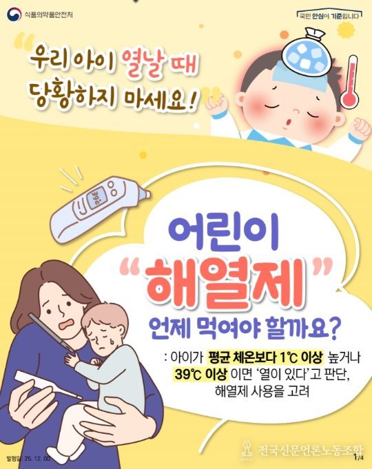 전국신문언론노동조합 강찬희 기자 | 식품의약품안전처 소속 식품의약품안전평가원(원장 강석연)은 겨울철에는 고열이 동반된 감기 및 독감 환자의 해열제 사용이 늘어남에 따라, 소아 해열제의 올바른 사용방법을 안내한다고 밝혔다.