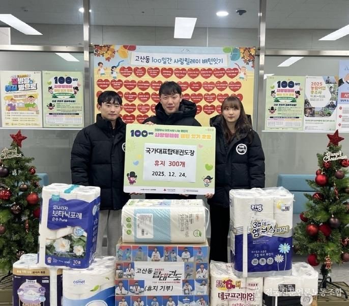전국신문언론노동조합 기자 | 의정부시 고산동주민센터는 12월 24일 고산동 소재 국가대표 탑 태권도장이 지역 저소득층을 위해 두루마리 화장지 300개를 기부했다고 밝혔다.