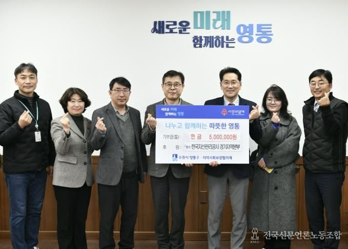 전국신문언론노동조합 기자 | 수원시 영통구는 지난 24일 한국자산관리공사 경기지역본부에서 관내 경제적으로 어려움을 겪는 이웃을 위해 성금 500만 원을 기부했다고 밝혔다.