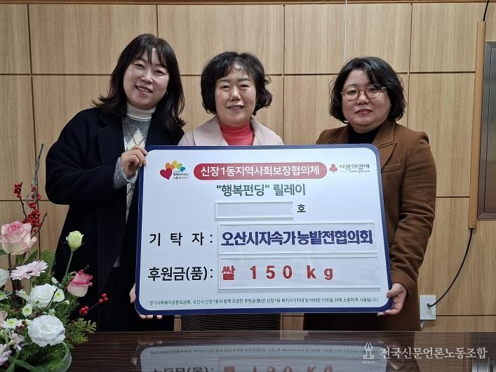 전국신문언론노동조합 기자 | 오산시 신장1동 행정복지센터는 지난 24일 오산시 지속가능발전협의회로부터 관내 취약계층 가구 지원을 위한 쌀 150kg를 기탁받았다고 밝혔다.
