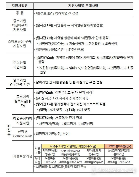 또한 정책자금, 창업·성장, R&D, 보증 분야에는 선정 절차 간소화, 평가 면제 또는 가점 부여, 지원한도 상향, 보증조건 우대 등 현장의 의견을 반영한 다양한 제도개선 사항이 적용된다.