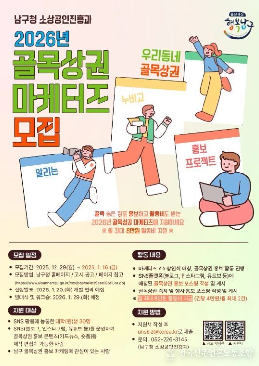 전국신문언론노동조합 강찬희 기자 | 울산 남구는 골목상권의 매력을 알리고 상권 활성화를 도모하기 위해 대학생 참여 홍보사업인 ‘골목상권 마케터즈’ 30명을 1월 16일까지 모집한다고 밝혔다.
