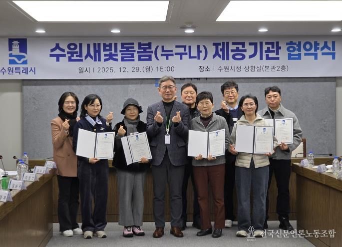전국신문언론노동조합 기자 | 수원특례시이 29일 시청 상황실에서 ‘수원새빛돌봄(누구나) 서비스 제공기관 재협약 협약식’을 열고, 서비스 제공기관들과 재협약을 체결했다.