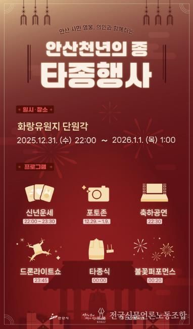 전국신문언론노동조합 기자 | 안산시는 오는 31일 오후 10시부터 화랑유원지 단원각에서 ‘2026 안산 천년의 종 타종 행사’를 개최한다고 30일 밝혔다.