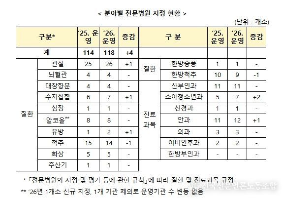 제5기 3차년도 전문병원 지정에 따라, 2025년 114개에서 2026년에는 118개 전문병원을 지정·운영하게 된다.