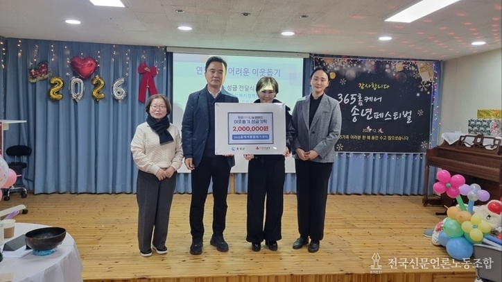 365홈케어 통합재가센터는 지난 12월 29일 충남 홍성군 홍성읍 K문화센터에서 ‘2025년 연말연시 송년회’를 열고, 어려운 이웃을 돕기 위한 성금 전달식을 함께 진행했다. 행사에는 요양보호사와 간호사, 사회복지사 등 장기요양 종사자 40여 명이 참석했다.