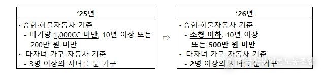 2026년부터는 소형 이하이면서 10년 이상 또는 500만 원 미만인 승합·화물차도 일반재산 환산율이 적용되고, 2명 이상의 자녀가 있으면 다자녀 가구로 인정된다.