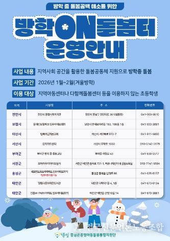 전국신문언론노동조합 강찬희 기자 | 충남사회서비스원은 1월 2일부터 겨울방학 기간 동안 돌봄이 필요한 아동을 위해 방학ON돌봄터를 발굴하여 운영을 지원한다.