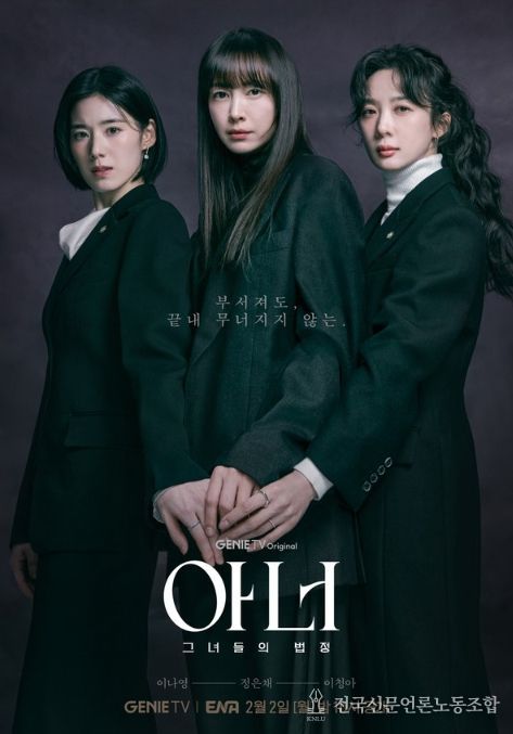 전국신문언론노동조합 강찬희 기자 | 지니 TV 오리지널 드라마 ‘아너 : 그녀들의 법정’ 이나영X정은채X이청아가 거대한 스캔들에 정면 돌파한다. 세 변호사의 ‘부서져도, 끝내 무너지지 않는’ 결연한 연대를 암시하는 메인 포스터가 전격 공개됐다.