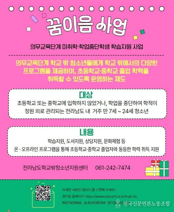 전국신문언론노동조합 김성길 기자 | (재)전라남도청소년미래재단 학교밖청소년지원센터(센터장 이윤조)는 2025년 한 해 동안 도내 학교 밖 청소년을 대상으로 ‘의무교육단계 미취학·학업중단학생 학습지원 사업(꿈이음)’을 운영하며, 학습 공백 해소와 배움의 기회 회복을 위한 다양한 지원을 추진했다.