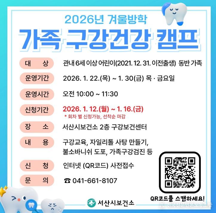 전국신문언론노동조합 강찬희 기자 | 충남 서산시가 겨울방학 기간을 맞이하여 '가족 구강건강 캠프'를 운영한다. 기간은 1월 22일부터 30일까지 2주간 목요일과 금요일이며, 총 4회에 걸쳐 진행될 예정이다.