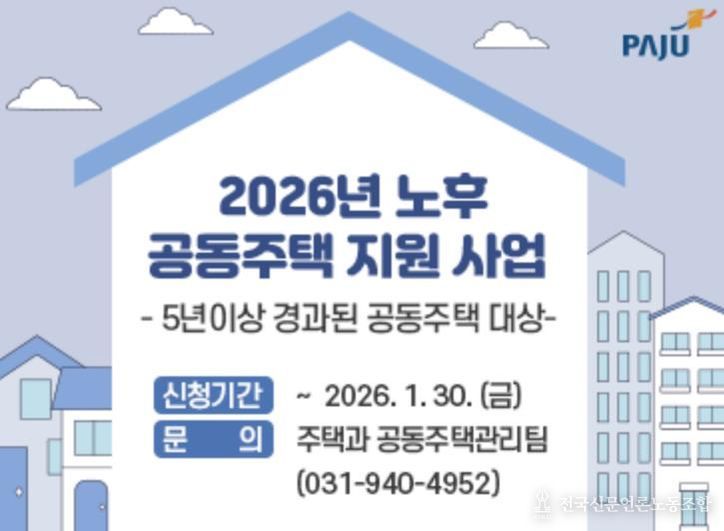 전국신문언론노동조합 기자 | 파주시는 노후 공동주택의 안전성과 주거환경 개선을 위해 녪년 노후 공동주택 시설물 보수 및 소규모 공동주택 유지관리 지원 사업’과 함께 ‘청소노동자 휴게시설 신청 지원 사업’을 추진한다고 밝혔다.