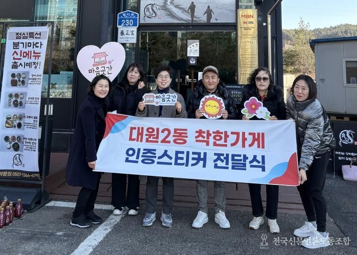 전국신문언론노동조합 기자 | 오산시 대원2동 행정복지센터는 지난 13일, 2026년 첫 번째 착한가게로 신규 선정된 ‘양심장어 오산청호점(엘지로 230)’에서 ‘착한날개(착한가게) 인증스티커 전달식’을 개최했다고 밝혔다.