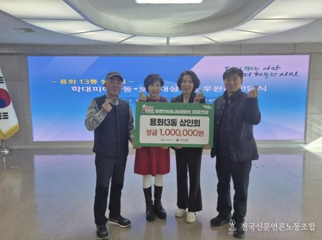 전국신문언론노동조합 강찬희 기자 | 아산시는 용화13통 상인회가 지역 내 학대 피해 및 보호대상을 위해 후원금을 기탁했다고 밝혔다.