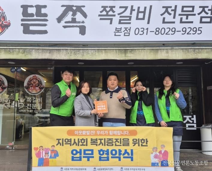 전국신문언론노동조합 기자 | 평택시 서정동 지역사회보장협의체는 지난 14일, 서정동에 있는 음식점 ‘뜯쪽!’을 '우리동네 착한가게'로 지정하고 현판 전달과 함께 지역사회 복지증진을 위한 협약을 체결했다.
