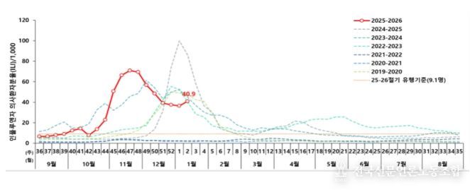 질병관리청에서 운영 중인 표본감시 결과, 의원급 의료기관의 인플루엔자 의사환자 분율은 11월 중순(‘25년 47주차) 이후 감소 추세를 보이다, ’26년 2주차(1.4.~1.10.) 에는 외래환자 1,000명당 40.9명으로 전주(36.4명) 대비 소폭 증가하면서, 이번 절기 유행기준(9.1명)보다 높은 수준으로 유행이 지속되고 있다.