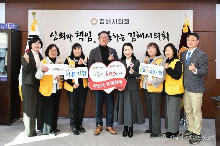 전국신문언론노동조합 강찬희 기자 | 김해시의회는 지난 16일 시의회 의장실에서 대한적십자사 경남지사에 2026년도 적십자 특별회비를 전달하며 어려운 이웃을 위한 따뜻한 나눔에 동참했다.