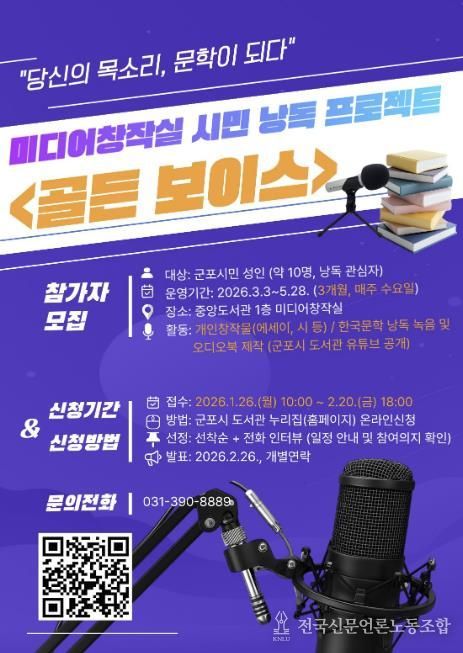 전국신문언론노동조합 기자 | 군포시 중앙도서관은 시민이 직접 참여하는 낭독 콘텐츠 제작을 통해 공공 문화콘텐츠를 확산하고, 시민의 창작 경험을 지원하기 위해 미디어창작실 시민 낭독 프로젝트 '골든 보이스'를 운영한다.