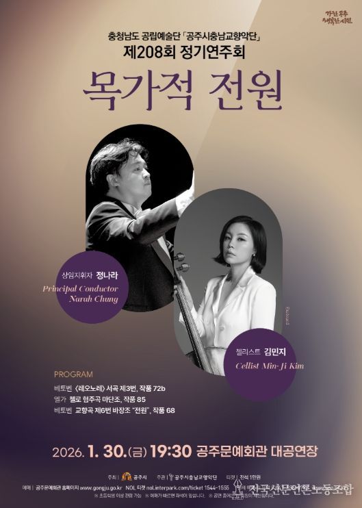 전국신문언론노동조합 강찬희 기자 | 충청남도 공립예술단 공주시충남교향악단은 오는 1월 30일19시 30분, 공주문예회관 대공연장에서 ‘목가적 전원’을 부제로 2026년 시즌의 첫 정기공연의 문을 연다.