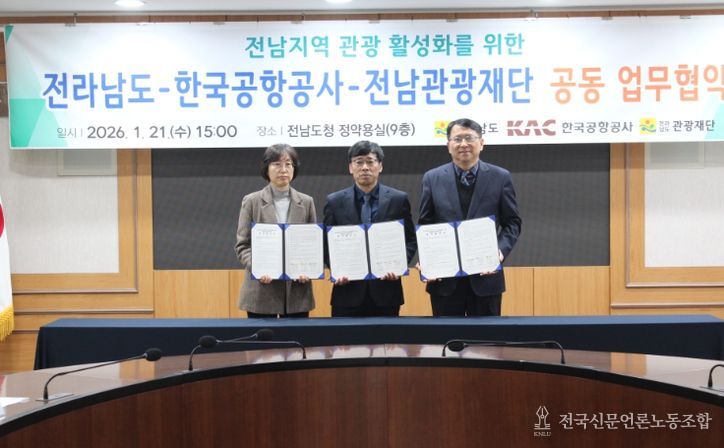 전국신문언론노동조합 김성길 기자 | 전라남도는 21일 한국공항공사, 전남관광재단과 함께 무안국제공항과 연계한 여행업계 지원 및 전남 관광 활성화 업무협약을 했다.