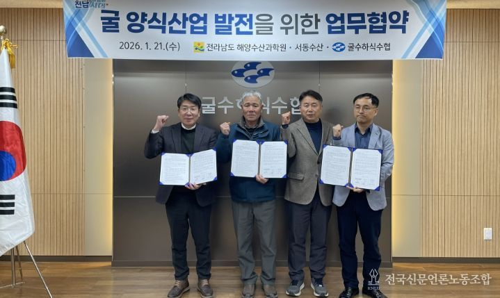 전국신문언론노동조합 김성길 기자 | 전라남도해양수산과학원 동부지부 여수지원은 21일 굴수하식수협, 굴 양식어업인과 기후변화 대응 굴 생산성 향상과 양식구조 개선 공동 연구를 위한 업무협약을 했다.