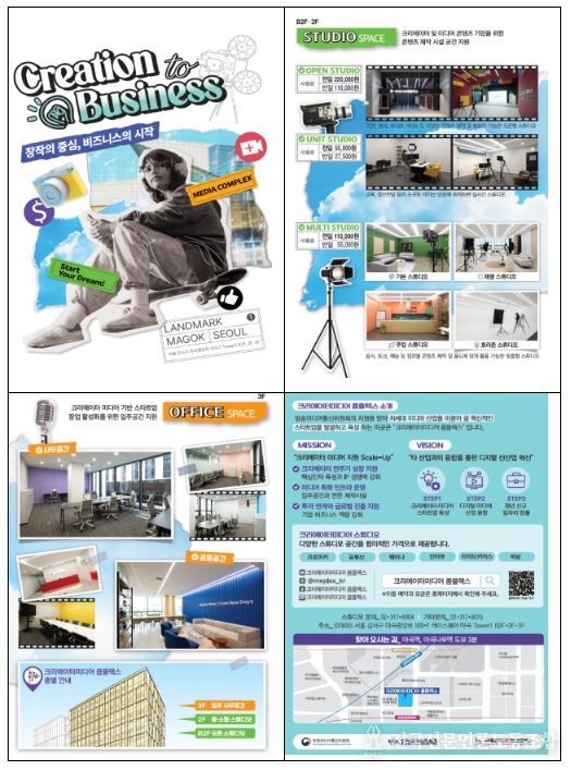 2021년 서울역에 개소한 ‘크리에이터미디어 콤플렉스’는 청년 기업들이 안정적으로 성장할 수 있도록 콘텐츠 제작 및 실시간 방송이 가능한 특화 제작 스튜디오와 독립 사무실 등을 제공하는 복합 공간으로, 미디어 새싹기업(스타트업)의 투자 유치와 사업 확장을 위한 전문 상담(컨설팅)을 진행하고 있다.