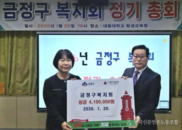 전국신문언론노동조합 이의용 기자 | 부산 금정구는 지난 20일 금정구 복지회에서 지역 내 복지 사각지대 위기가구 정기 지원을 위해 이웃돕기 성금을 기탁했다고 밝혔다.