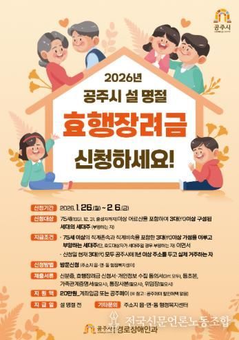 전국신문언론노동조합 강찬희 기자 | 공주시는 지역사회 효 문화 확산과 효행 문화 발전을 위해 설 명절을 맞아 ‘효행장려금’을 지급한다고 22일 밝혔다.