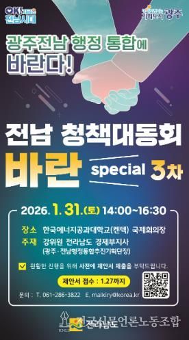 전국신문언론노동조합 김성길 기자 | 전라남도는 오는 31일 오후 2시 한국에너지공과대학교 국제회의장에서 전남 청책대동회 ‘바란’을 개최한다.