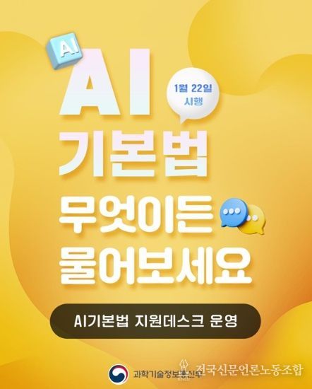 전국신문언론노동조합 강찬희 기자 | AI 산업 진흥 기반을 조성하기 위한 '인공지능기본법'이 1월 22일 시행됩니다.