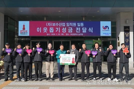 전국신문언론노동조합 이의용 기자 | (자)보수산업은 지난 1월 22일, 부산 남구청을 방문해 직원들이 십시일반 정성을 모아 마련한 성금 500만 원을 기부했다고 밝혔다.
