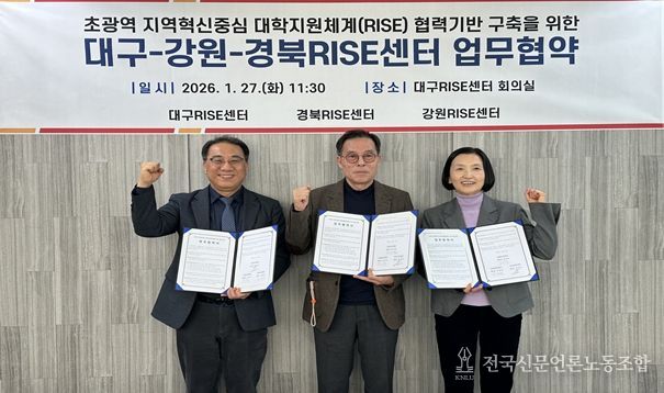 전국신문언론노동조합 강찬희 기자 | 강원라이즈(RISE)센터(센터장 김미숙)는 1월 27일 대구라이즈센터 회의실에서 대구라이즈센터(센터장 최정건), 경북라이즈센터(센터장 박대현)와 ‘초광역 RISE 협력체계 구축을 위한 업무협약’을 체결했다고 밝혔다.