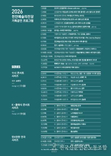 2026년 시즌의 시작은 최근 열린 천안예술의전당 신년음악회에서 국립심포니오케스트라와 홍석원 지휘 아래 첼리스트 문태국이 웅장한 무대로 알렸으며, 이후 △3월, 화이트데이 콘서트 ‘차이콥스키 피아노 트리오’·리투아니아 체임버오케스트라 with 첼리스트 홍진호 △4월, 스프링콘서트 ‘고잉홈프로젝트 with 피아니스트 손열음’ △5월, 뮤지컬 ‘어쩌면 해피엔딩’ △6월, 바이올리니스트 대니 구 데뷔 10주년 리사이틀 ‘The Journey Begins’·천안예술의전당 페스티벌 오케스트라 with 지휘 홍석원이 이어진다.