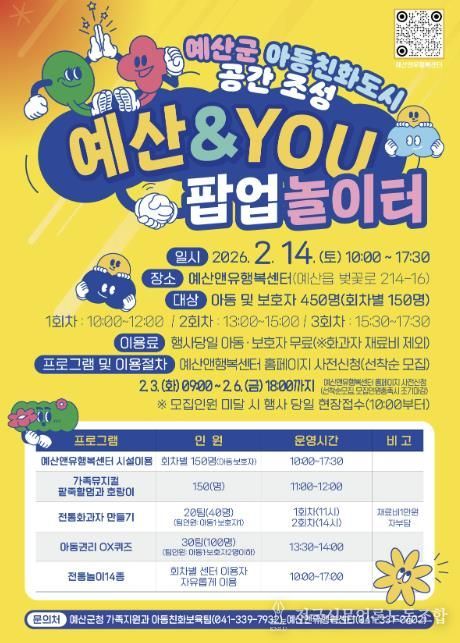 군 관계자는 “아동친화도시 조성의 하나로 ‘예산앤유(&YOU) 팝업놀이터’를 처음 추진하는 만큼 아동 모두가 주인공이 돼 마음껏 즐길 수 있는 특별한 시간이 되길 바란다”며 “앞으로도 아동이 폭넓은 문화 경험을 누릴 수 있도록 다양한 프로그램을 운영해 아동친화도시 조성에 힘쓰겠다”고 말했다.