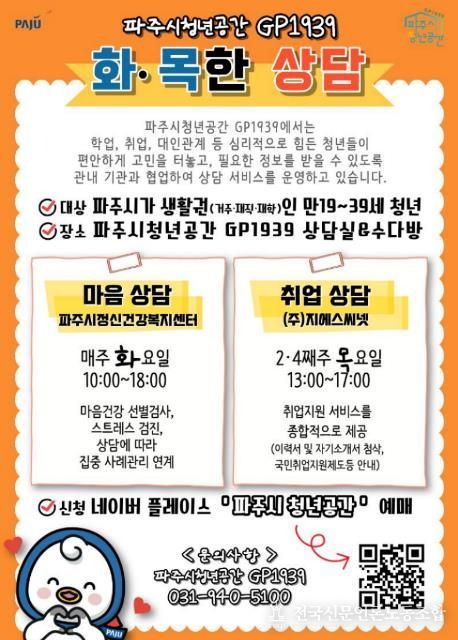 전국신문언론노동조합 기자 | 파주시는 청년들의 심리 안정과 취업 역량 강화를 위해 파주시청년공간 지피(GP)1939에서 진행하는 상담 프로그램 ‘화·목한 상담’의 참여자를 모집한다.