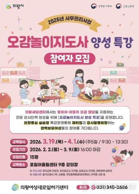 전국신문언론노동조합 기자 | 의왕시 여성새로일하기센터가 '오감놀이지도사 양성 특강'의 교육생을 모집한다.