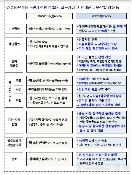 이에 기획예산처는 그 첫 발걸음으로 2018년에 도입된 국민참여 예산제도를 획기적으로 확대·개편하고 2026년을 참여예산제도 도입 제2의 원년으로 삼고자 한다.