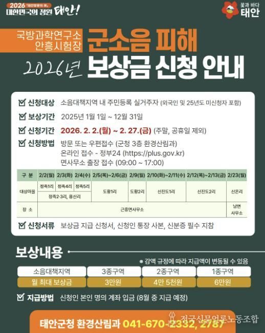 전국신문언론노동조합 강찬희 기자 | 태안군이 국방과학연구소 안흥시험장 인근 소음대책지역 거주 주민을 대상으로 오는 2월 2일부터 2월 27일까지 소음피해 보상금 지급 신청을 받는다.