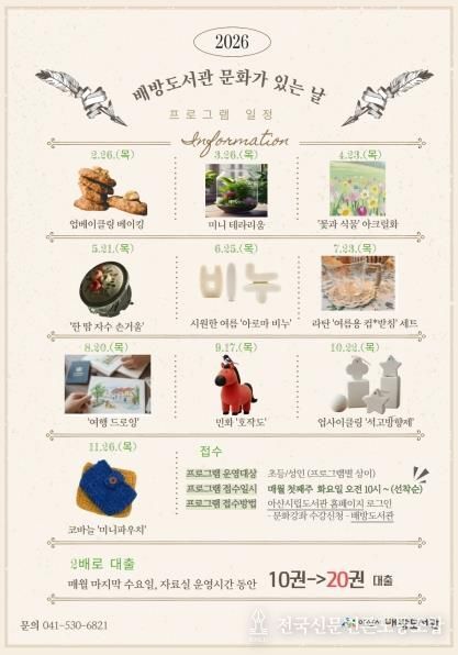 전국신문언론노동조합 강찬희 기자 | 배방도서관은 2월부터 11월까지 매달 하루를 지정해 ‘도서관 문화가 있는 날’ 프로그램을 운영할 계획이다.