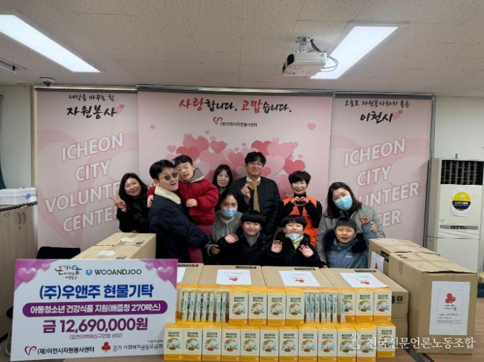 전국신문언론노동조합 기자 | 이천시자원봉사센터는 1월 30일 센터 다목적실에서 ㈜우앤주(대표 송우)의 지원으로 현물 기탁식을 진행했다.
