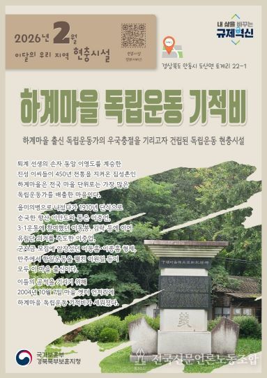 전국신문언론노동조합 강찬희 기자 | 경북북부보훈지청은 2026년 2월 이달의 우리 지역 현충시설로 ‘하계마을 독립운동 기적비’(경상북도 안동시 도산면 토계리 22-1)를 선정했다.