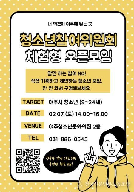 전국신문언론노동조합 기자 | 여주청소년문화의집은 여주시 청소년들이 정책과 사업 과정에 주체적으로 참여할 수 있도록 운영되는 공식 청소년 참여기구인 여주시청소년참여위원회 ‘너울’ 제20기 신입위원을 모집한다고 밝혔다.
