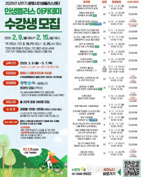 전국신문언론노동조합 기자 | 광명시 인생플러스센터는 신중년의 인생 2막 탐색과 준비를 지원하는 ‘2026년 상반기 인생플러스 아카데미’ 수강생 380명을 오는 9일부터 선착순 모집한다.