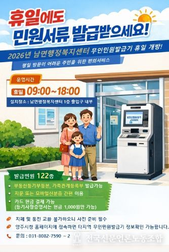 전국신문언론노동조합 기자 | 양주시 남면 행정복지센터는 행정복지센터 내에 설치된 무인민원발급기 운영일을 기존 평일에서 휴일까지 확대해 지난 17일부터 운영을 시작했다고 밝혔다.